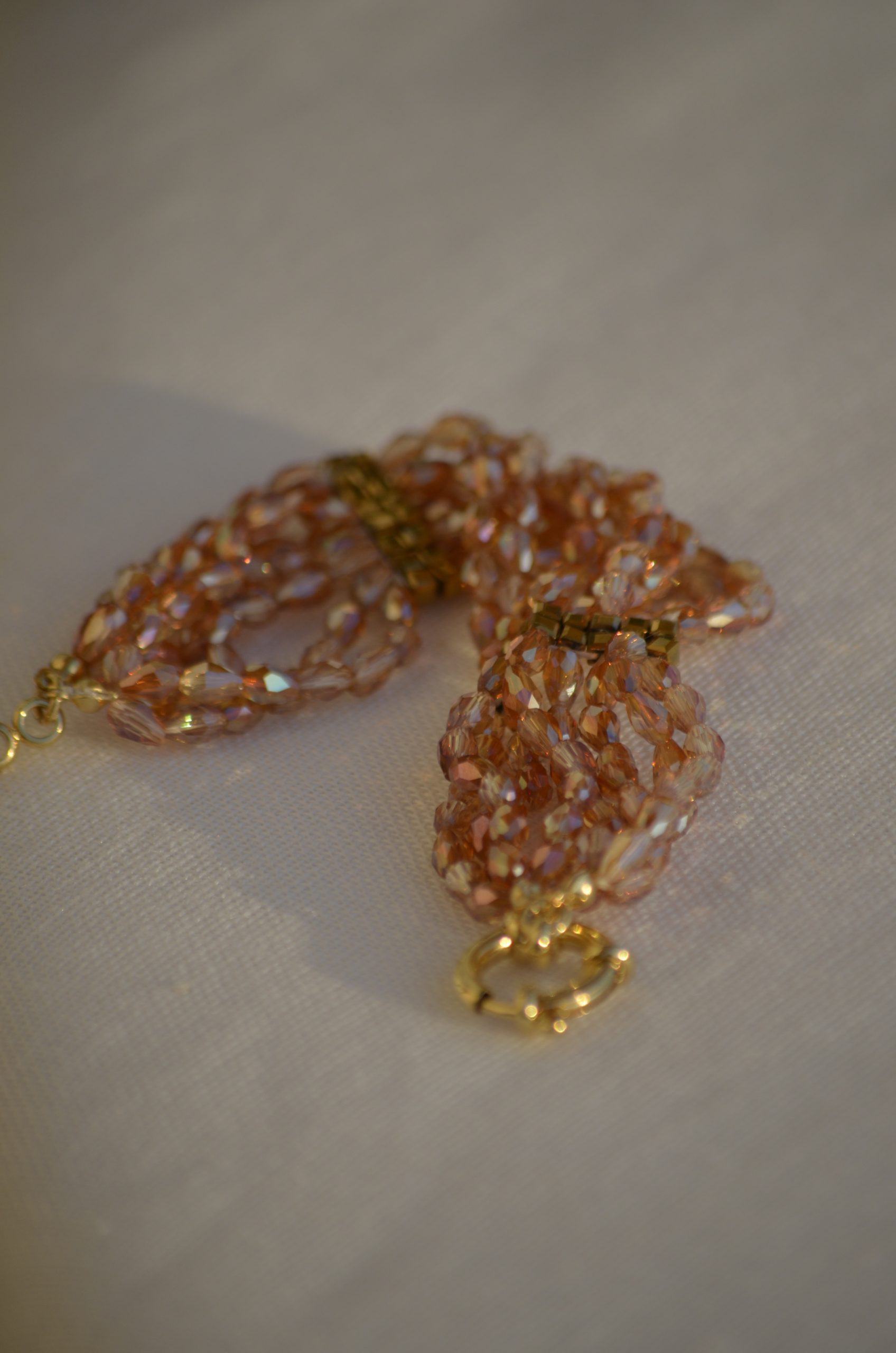 Brazalete con cuentas de cristales engarzadas a mano. Cadena y piezas doradas de plata de ley bañada en oro de 18K y acero inoxidable.