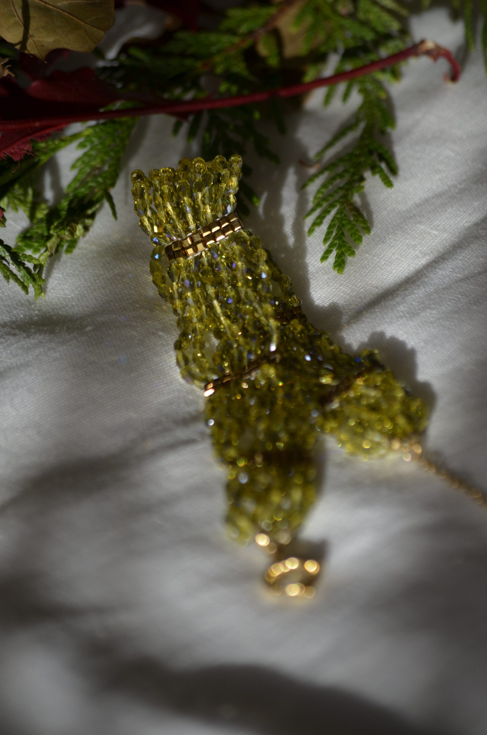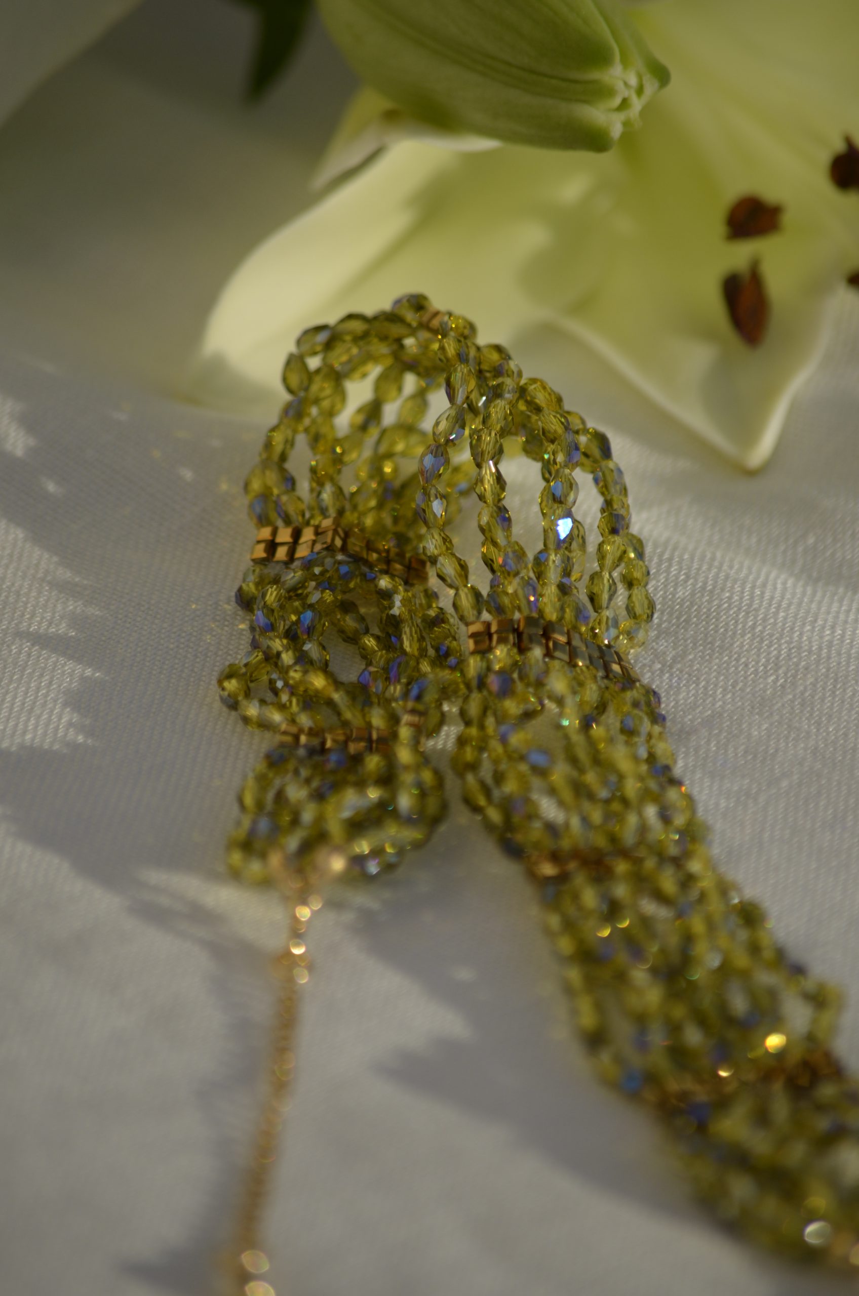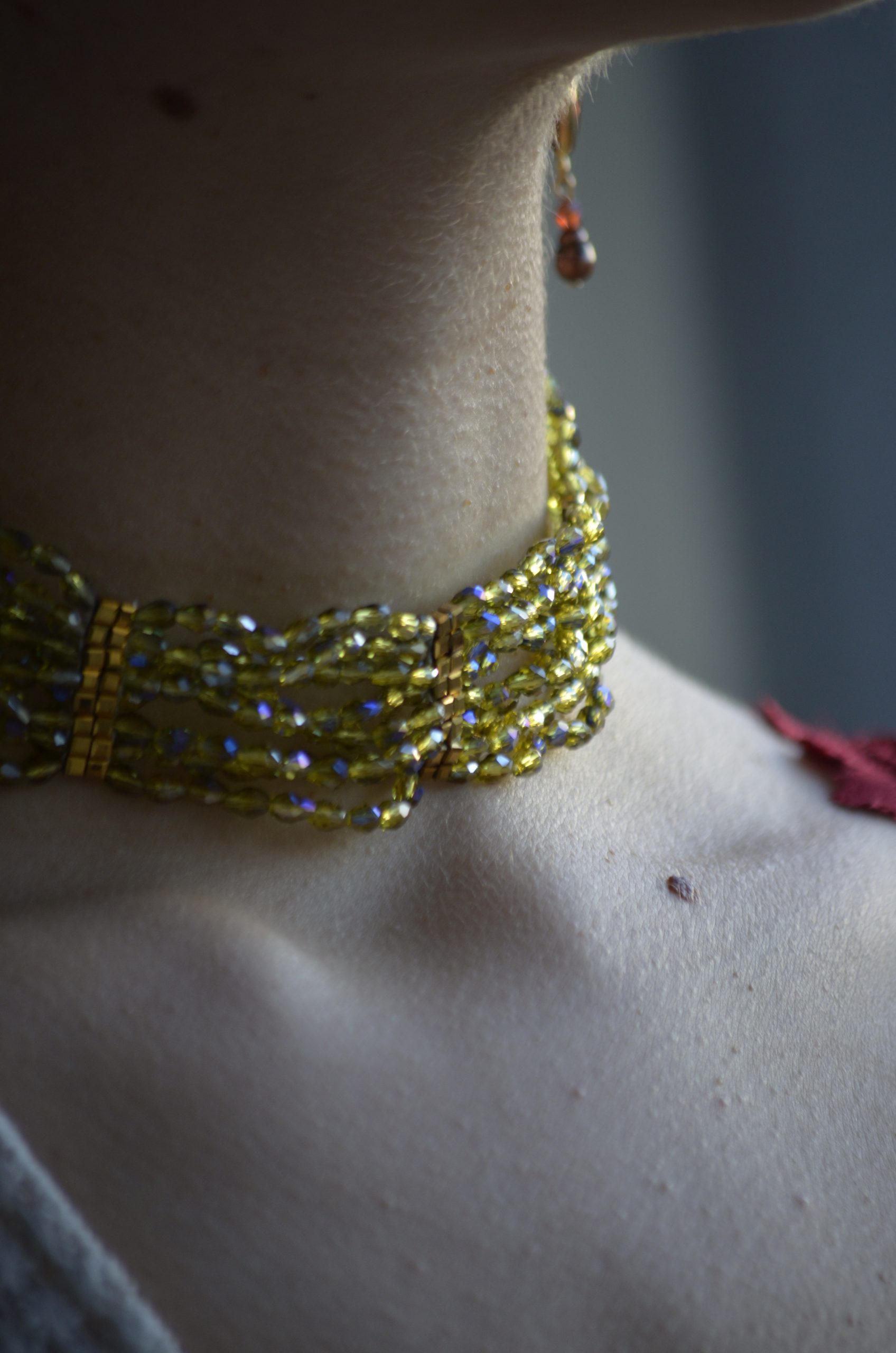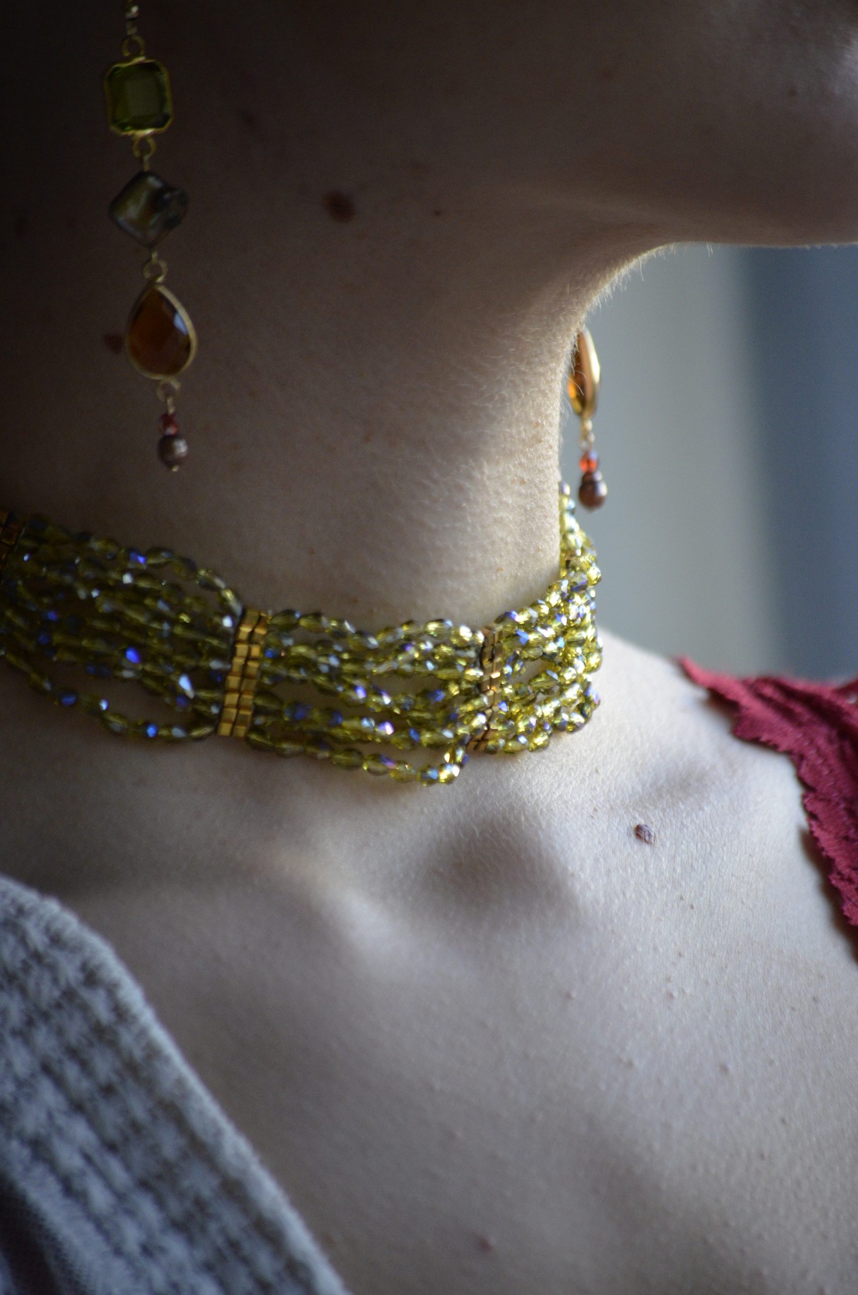 Choker con cuentas de cristales engarzadas a mano. Cadena y piezas doradas de plata de ley bañada en oro de 18K y acero inoxidable.