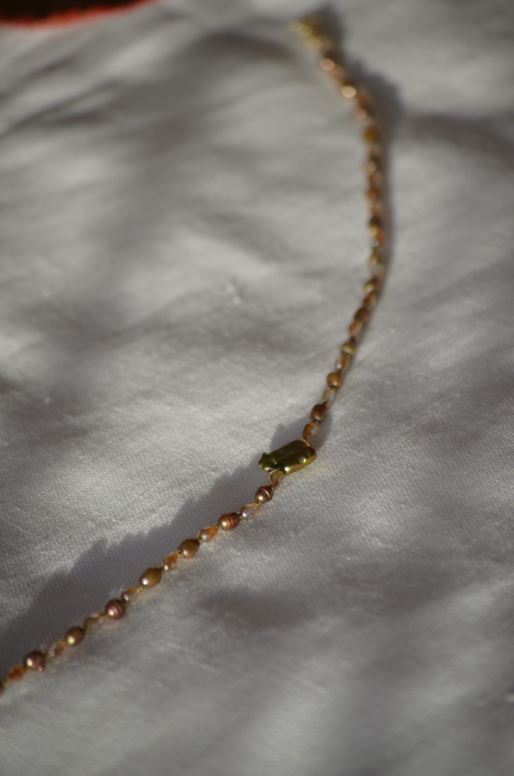 Gargantilla de cristales y perlas de agua dulce con cierre dorado de plata bañada en oro de 18K.