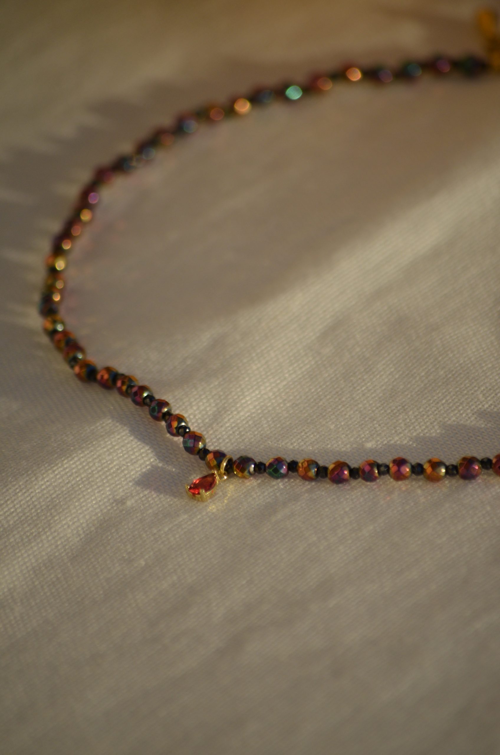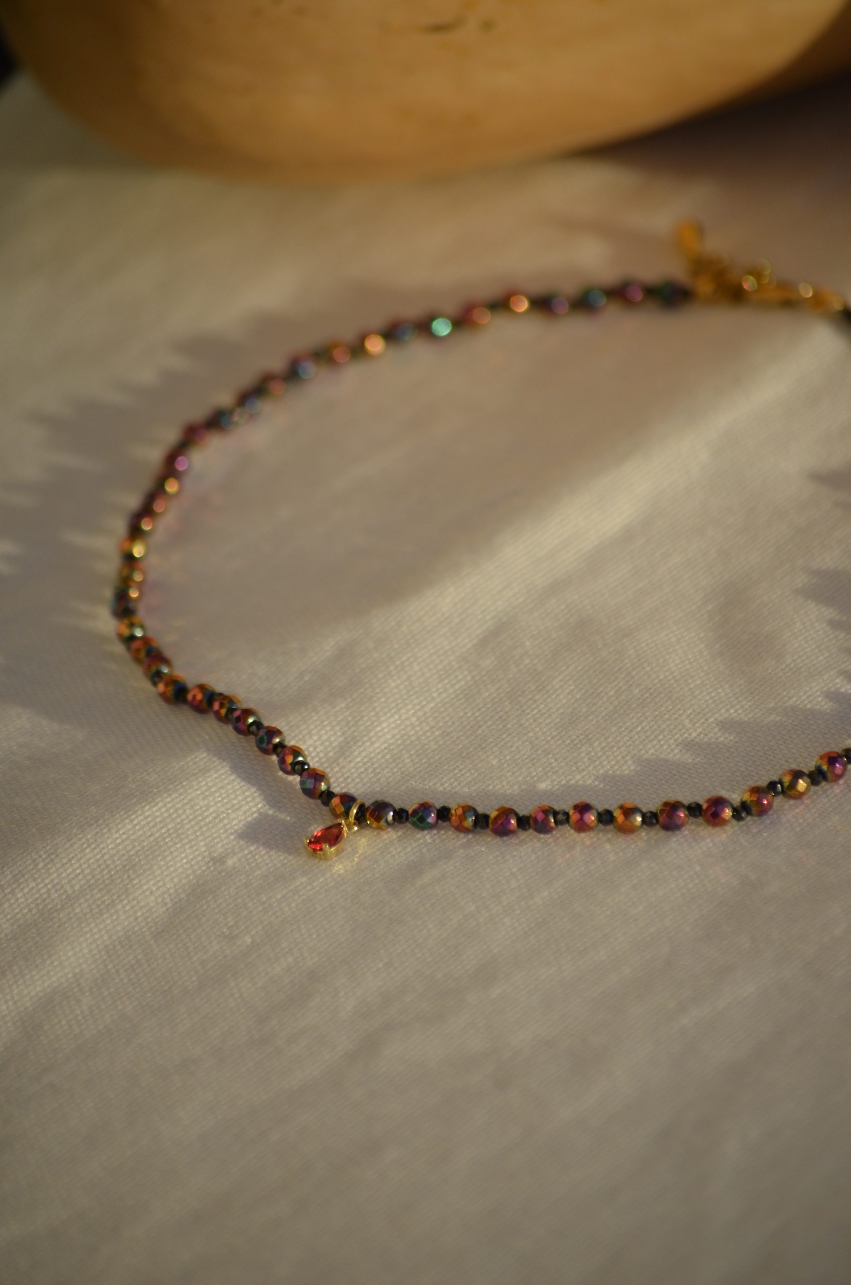 Gargantilla de cuentas de hematita y lágrima de cristal. Cierre resistente de acero inoxidable.