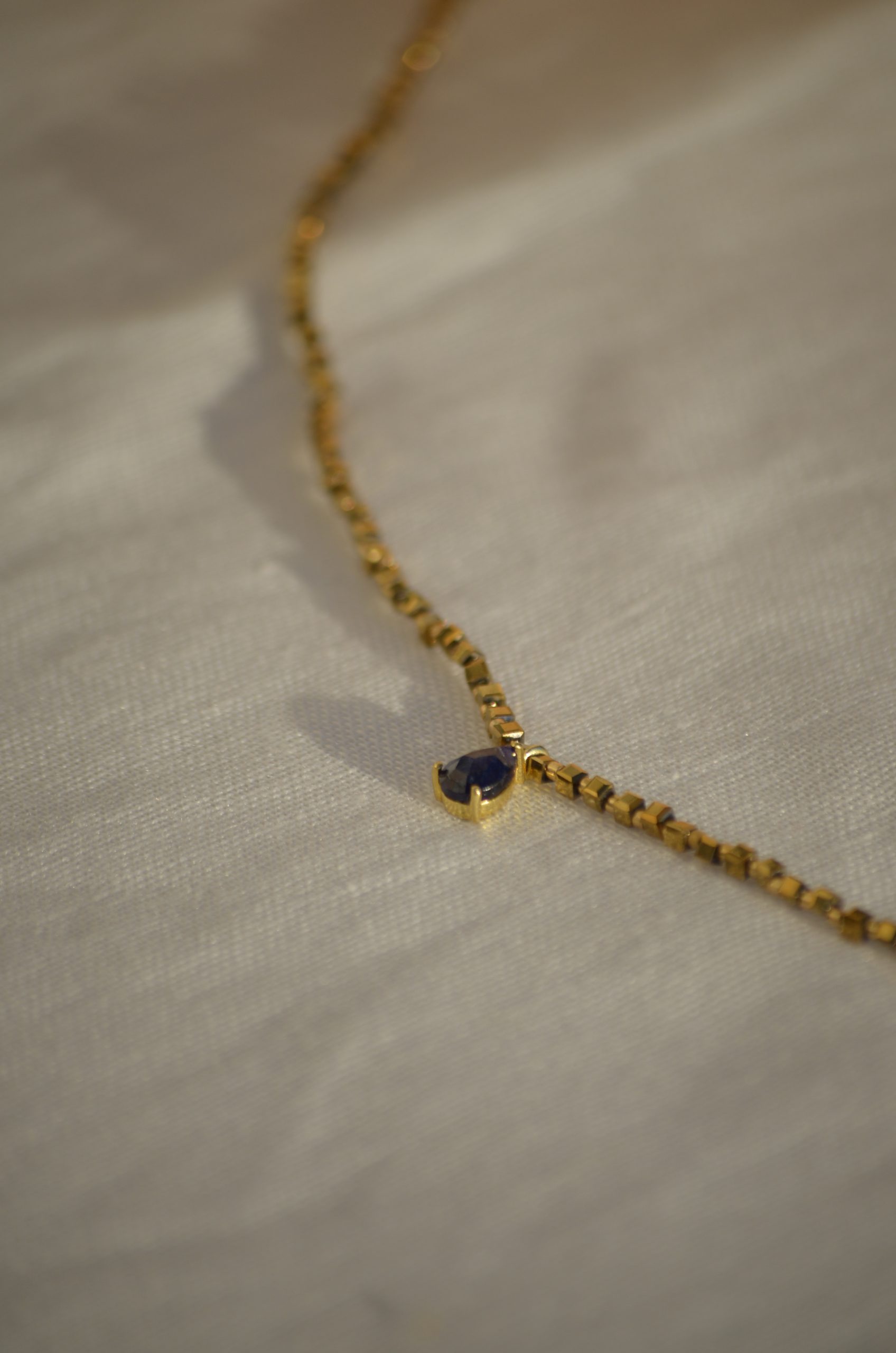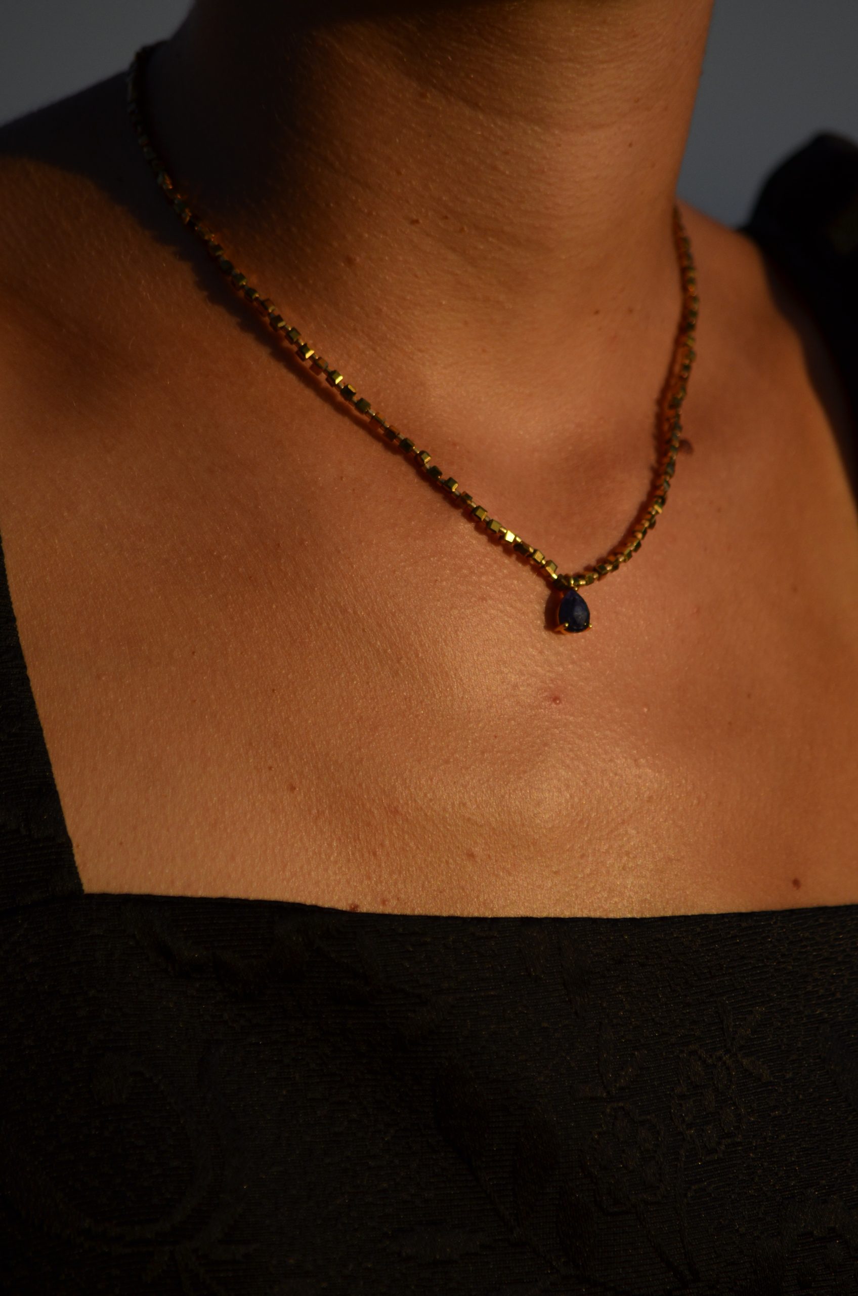Gargantilla de cuentas de cristal y lágrima de lapislázuli. Cierre resistente de acero inoxidable.