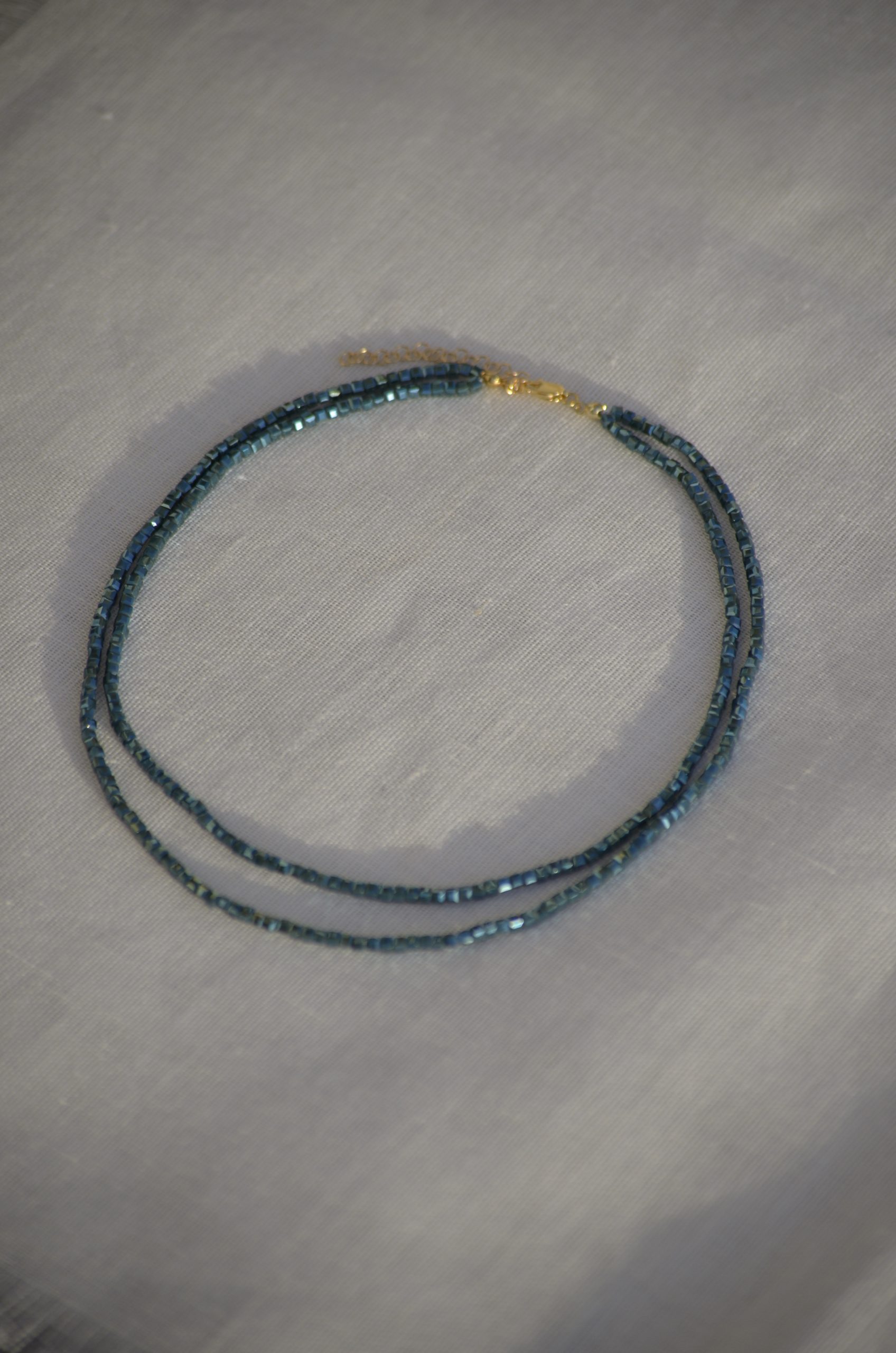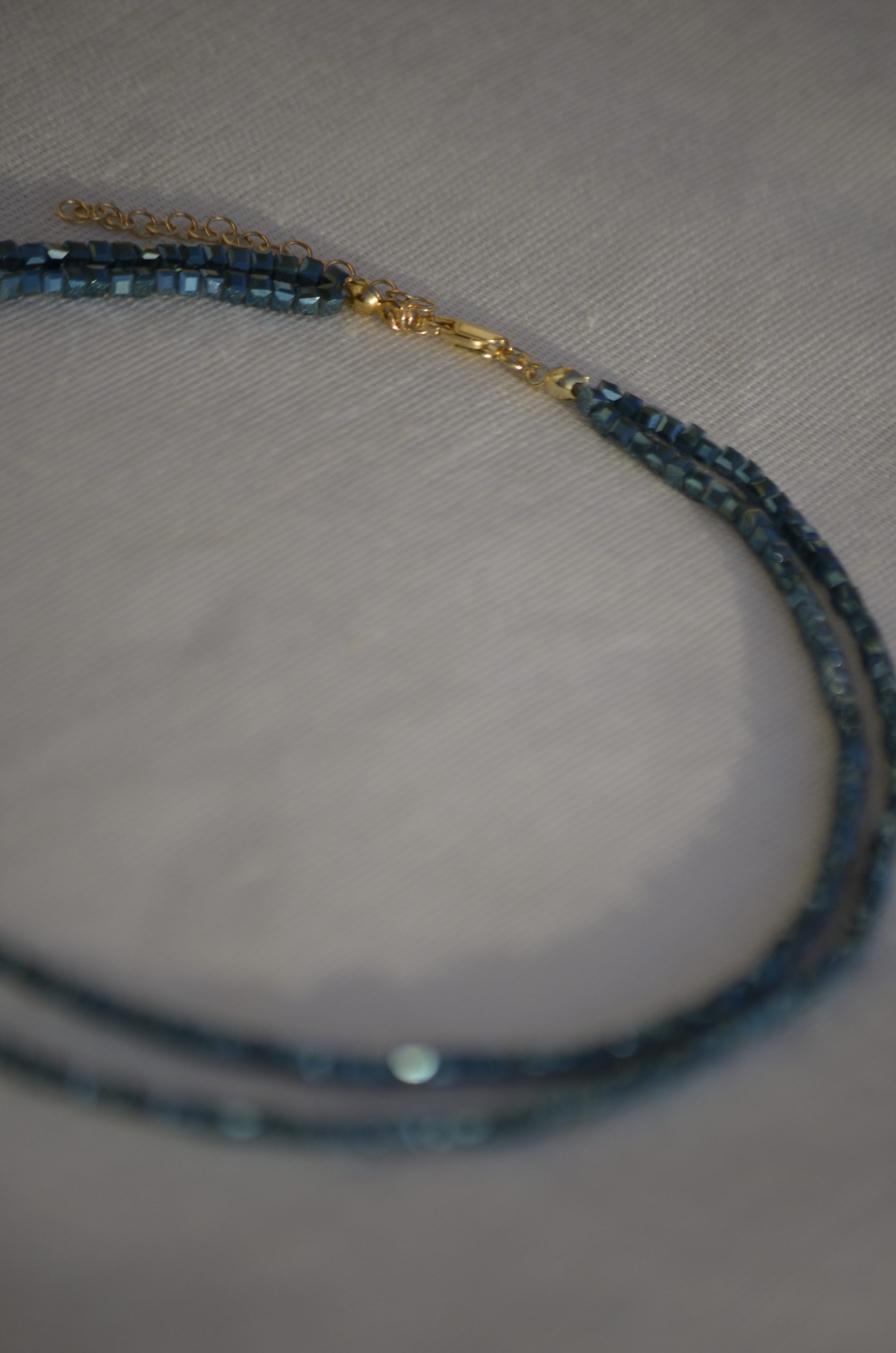 Gargantilla con cuentas de cristales engarzadas a mano. Cadena y piezas doradas de plata de ley bañada en oro de 18K.