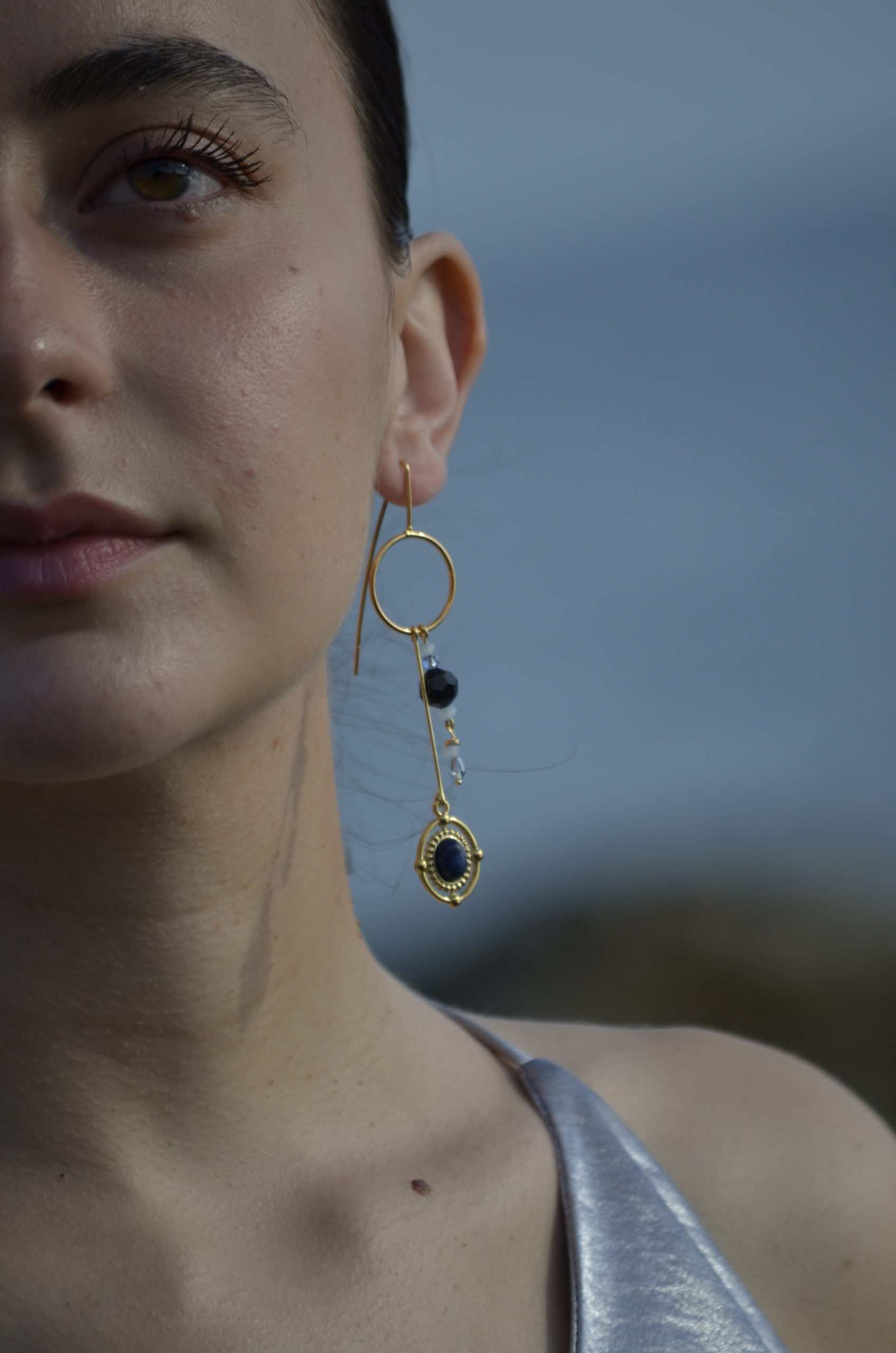 Instrucciones de cuidado: guardar siempre dentro de su bolsita, en un lugar limpio y seco alejado de cremas, aceites, perfumes… Por sus características, el latón podría oscurecerse al entrar en contacto con estos productos. Para su limpieza se aconseja usar únicamente un paño seco. Evitar contacto con agua y tratar con mucho mimo: sobre todo las partes de arcilla polimérica podrían romperse si se caen o se doblan.