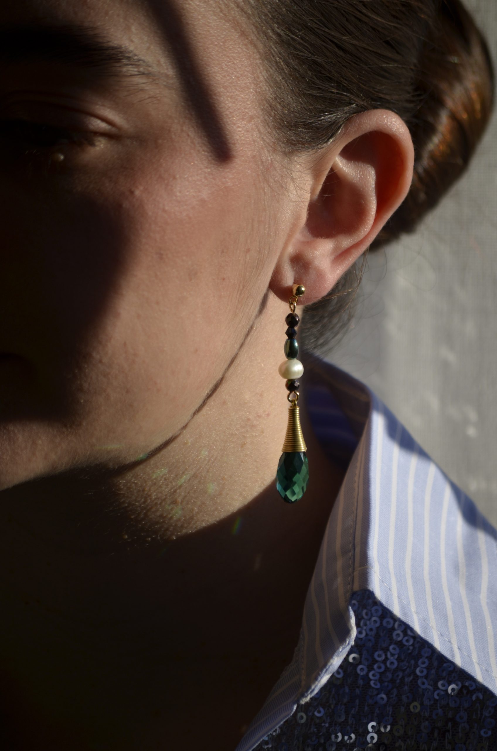 Pendientes con circonitas y cuarzo rosa engarzadas en piezas doradas de latón y acero inoxidable.