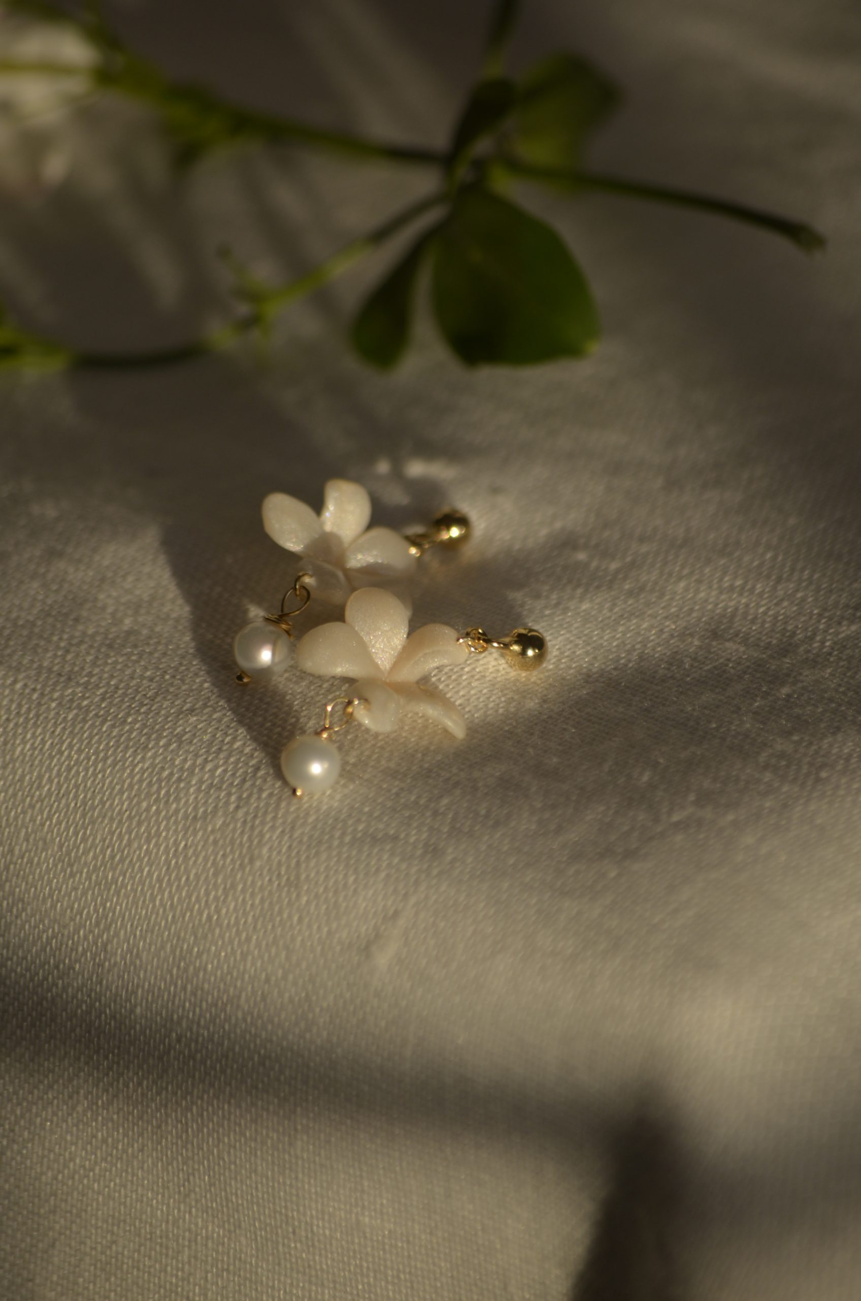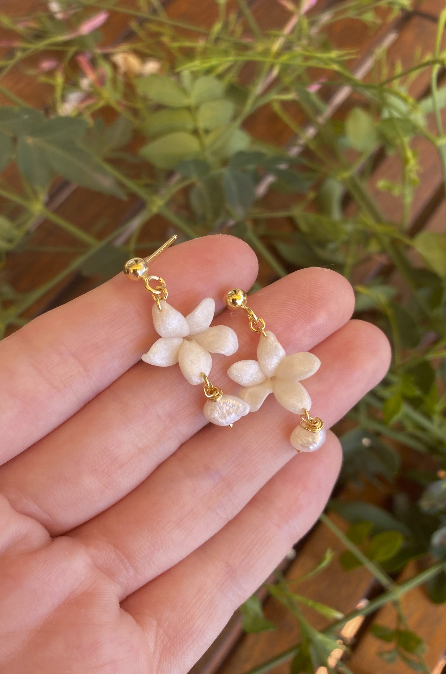 Pendientes con flores de jazmín modeladas a mano en arcilla polimérica. Enganches de plata bañada en oro de 18K.