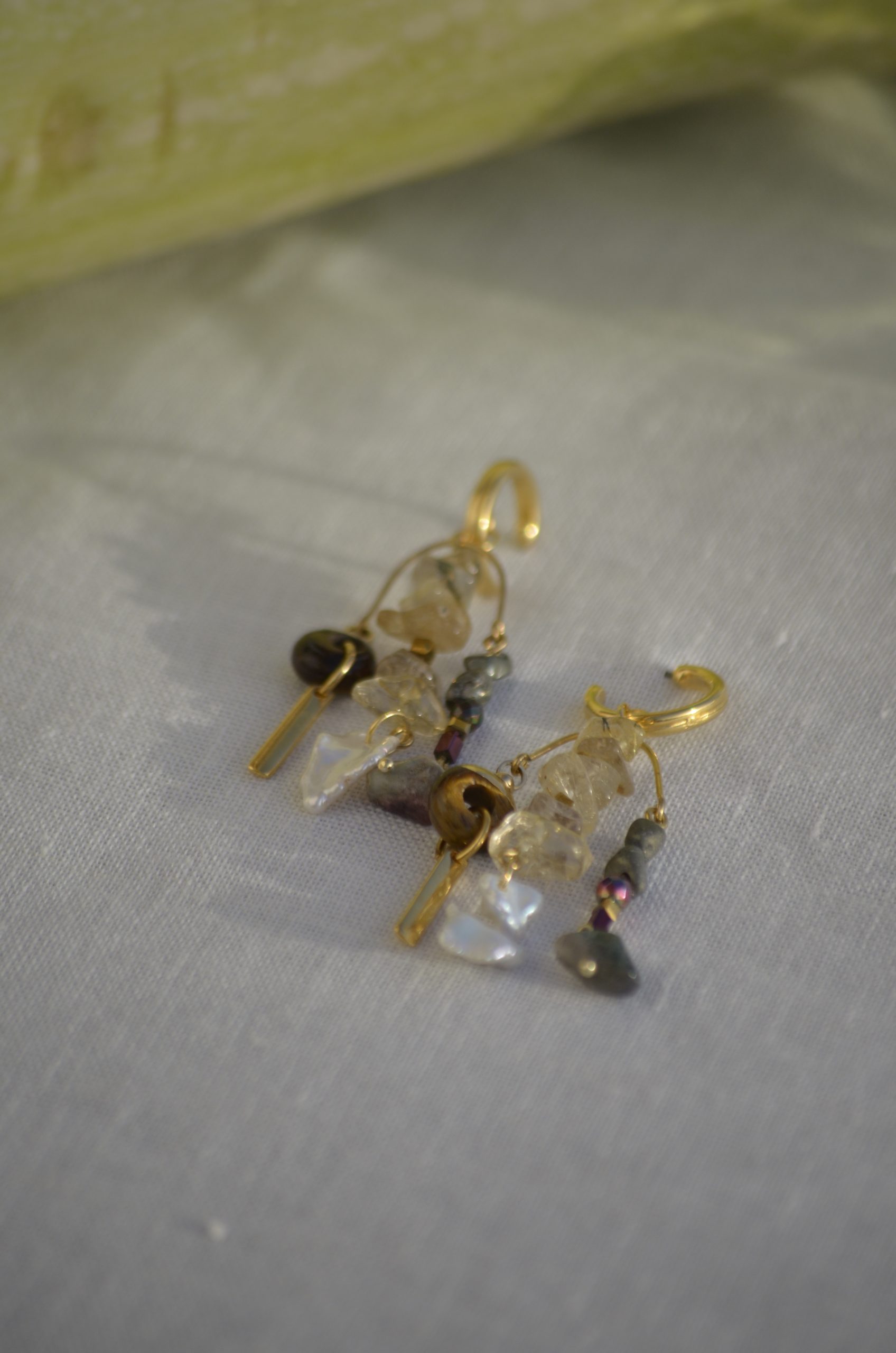 Pendientes irregulares con nácar, piedras naturales y cristal.