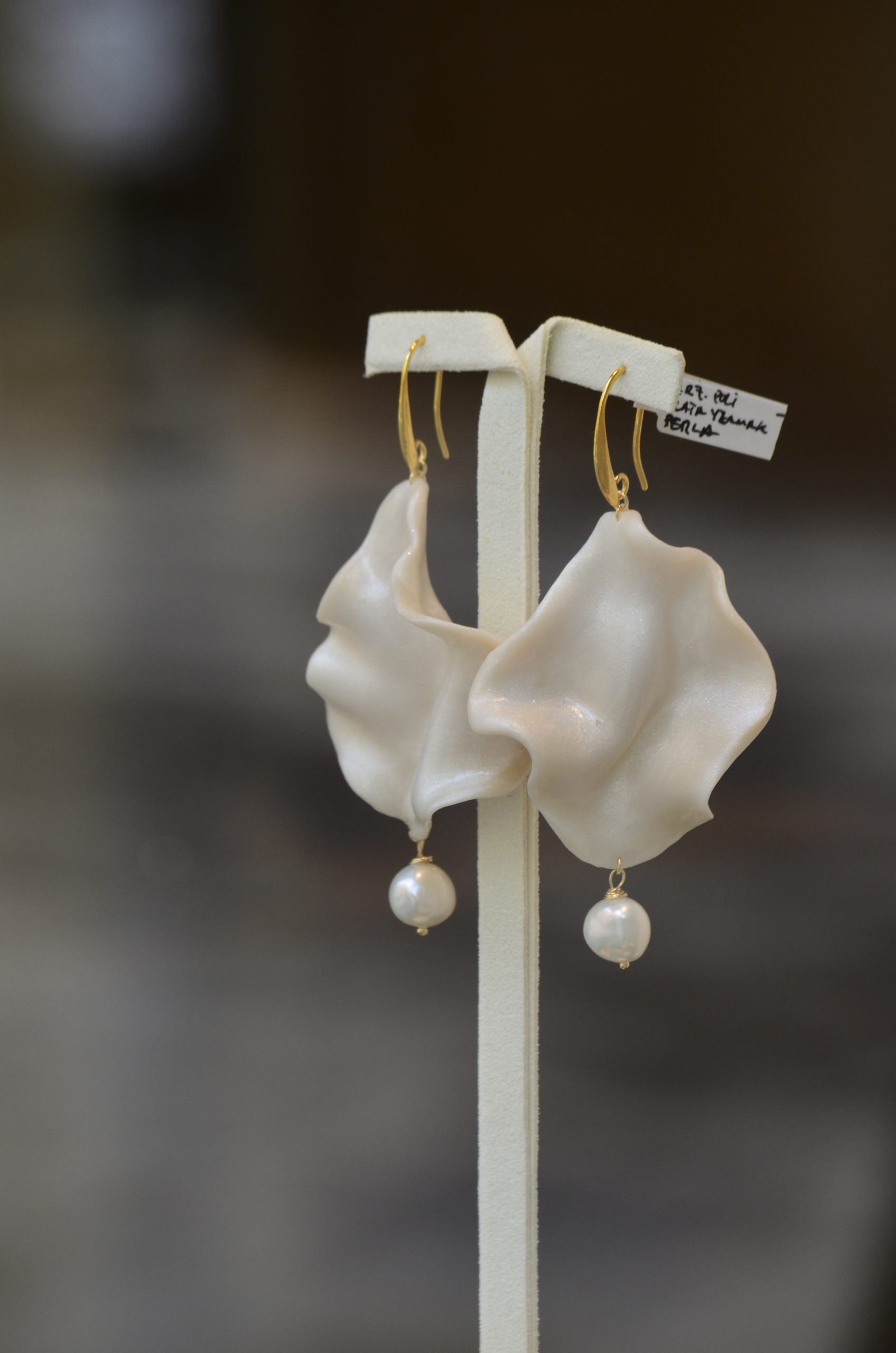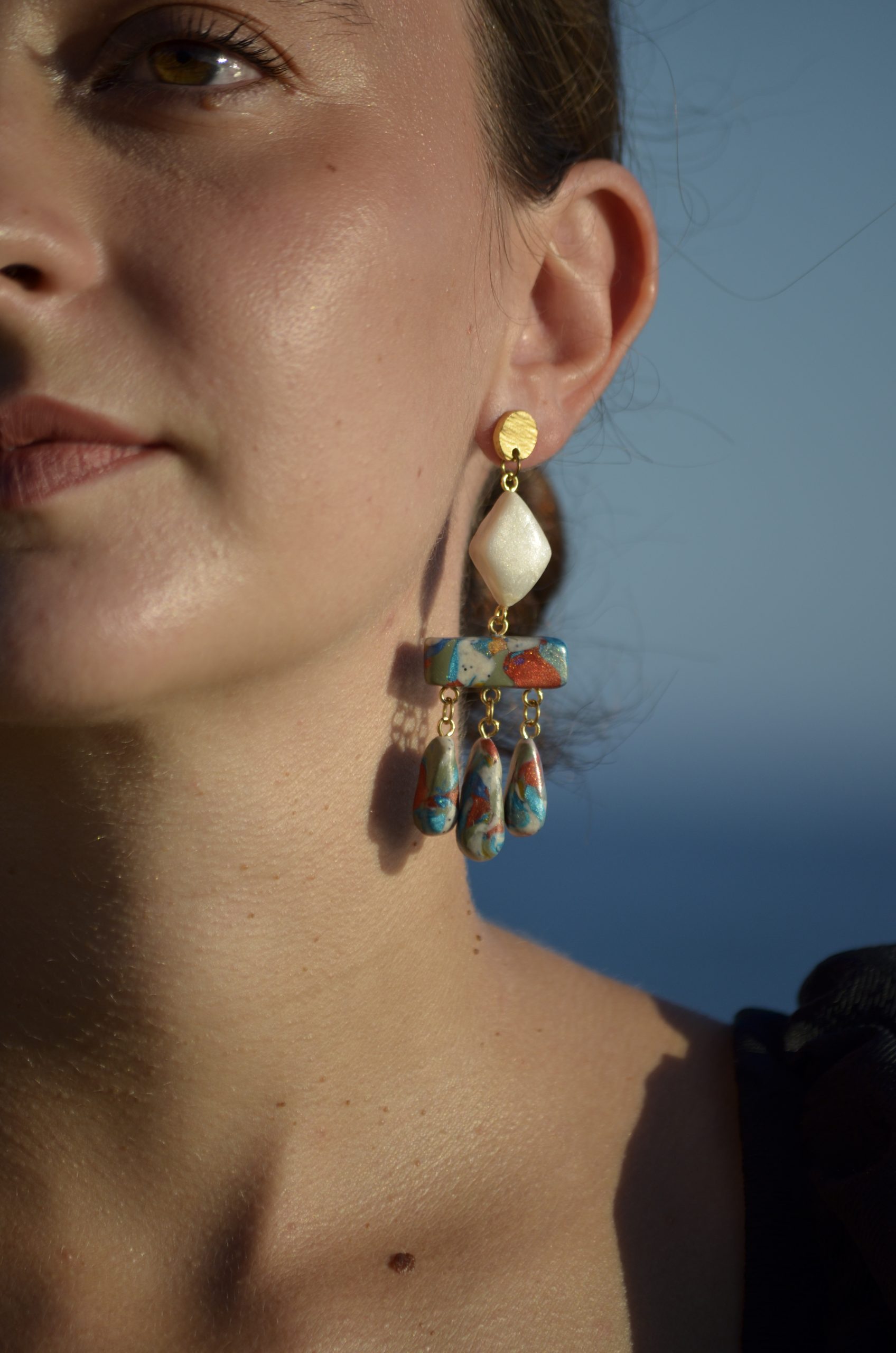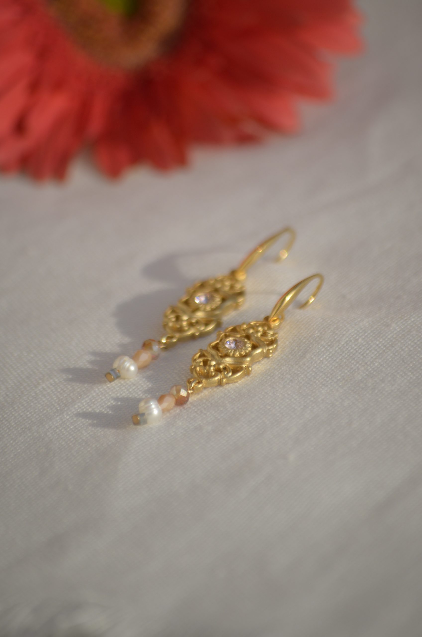 Pendientes con cuentas de cristales y perlas de agua dulce engarzadas a mano. Piezas metálicas de latón y zamak en color dorado. Son hipoalergénicos (sin níquel).