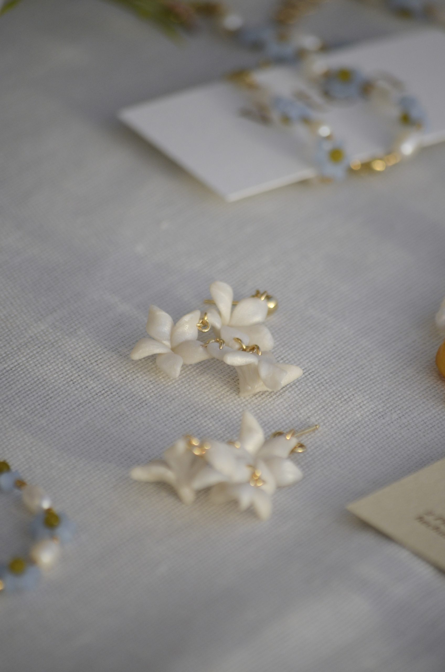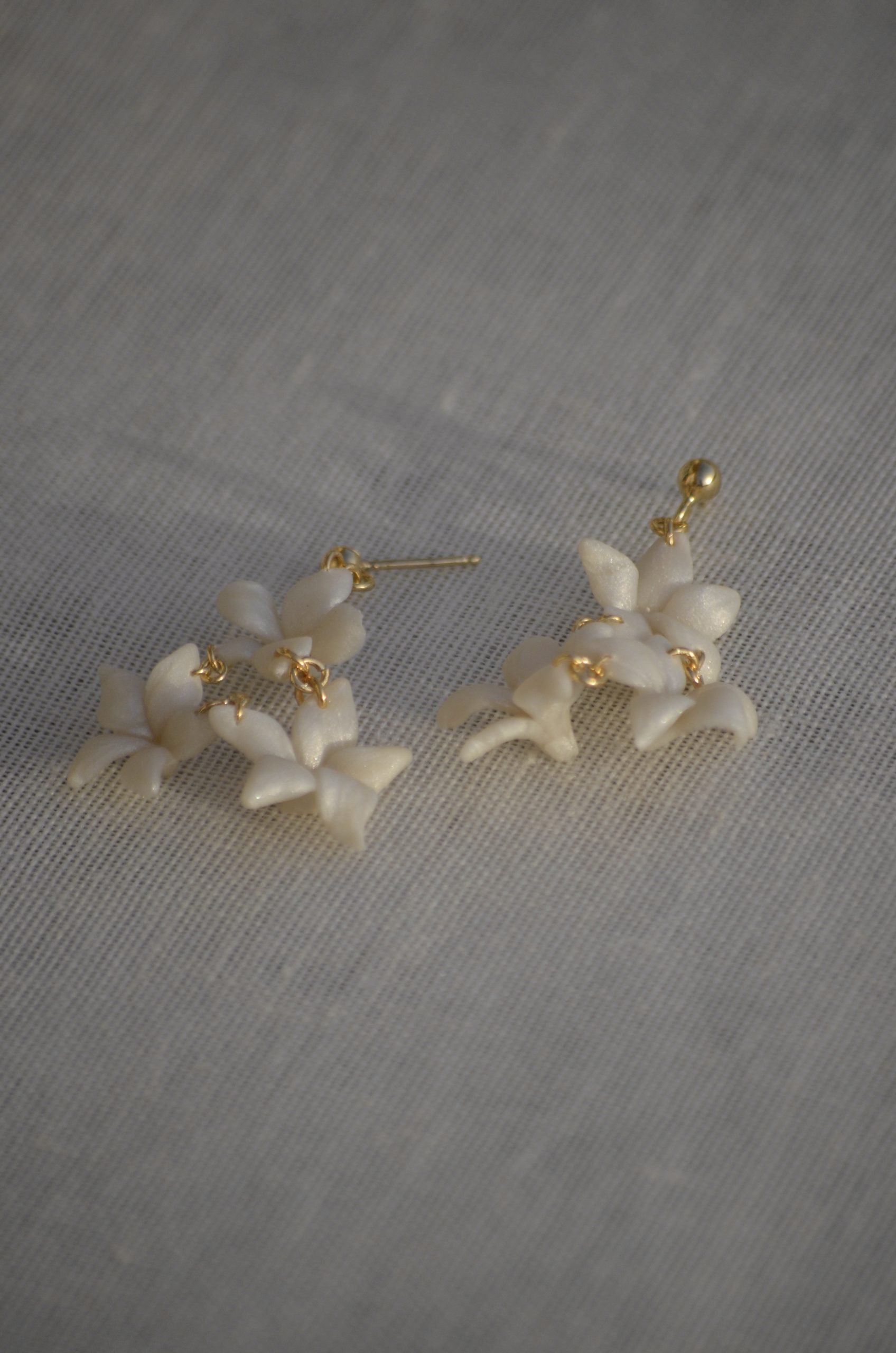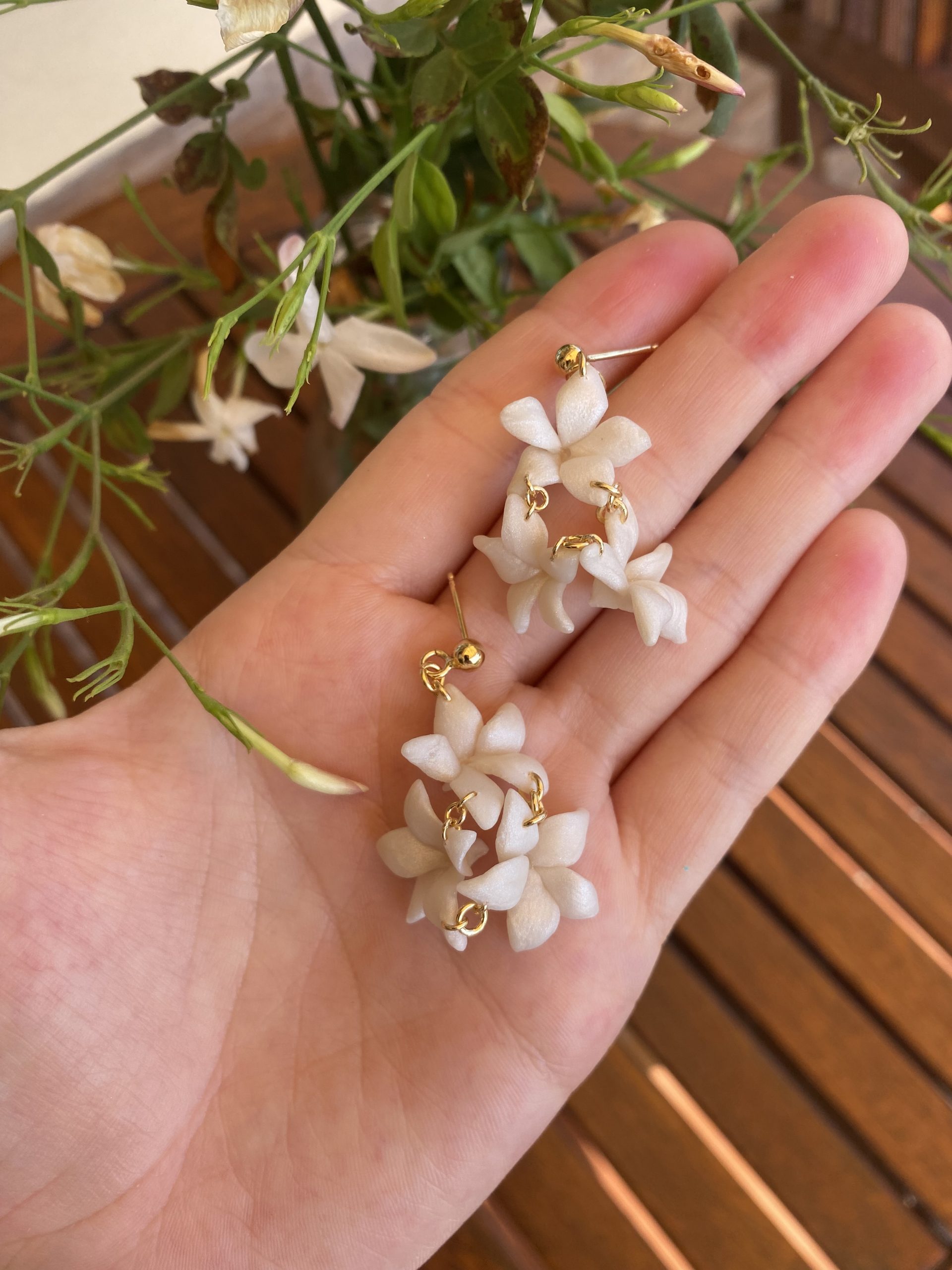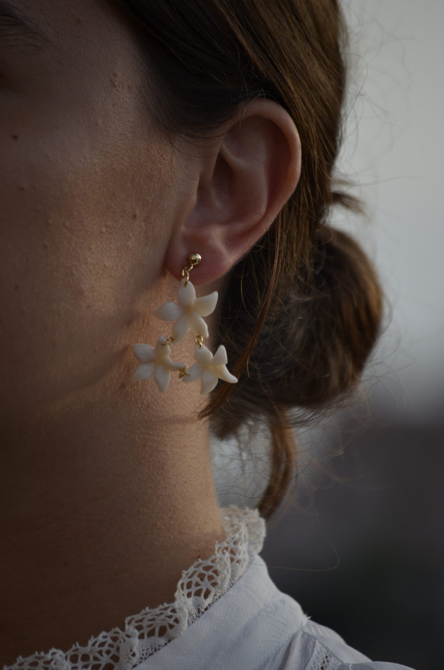 Pendientes con flores de jazmín modeladas a mano en arcilla polimérica. Enganches de plata bañada en oro de 18K.