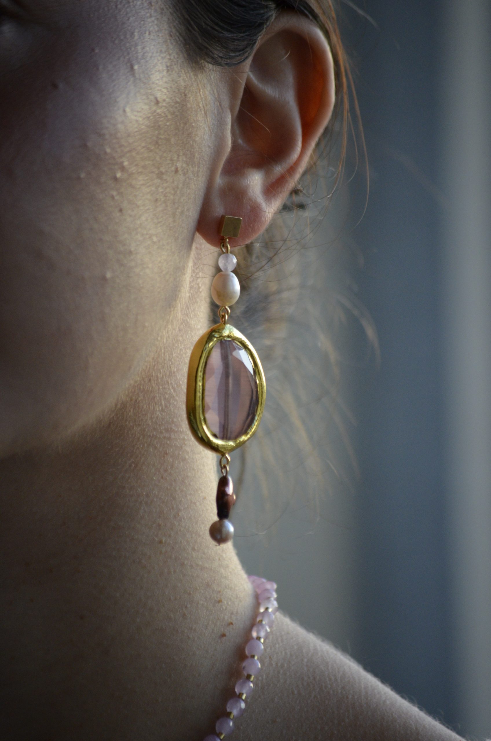 Pendientes con cristales y perlas irregulares de agua dulce.