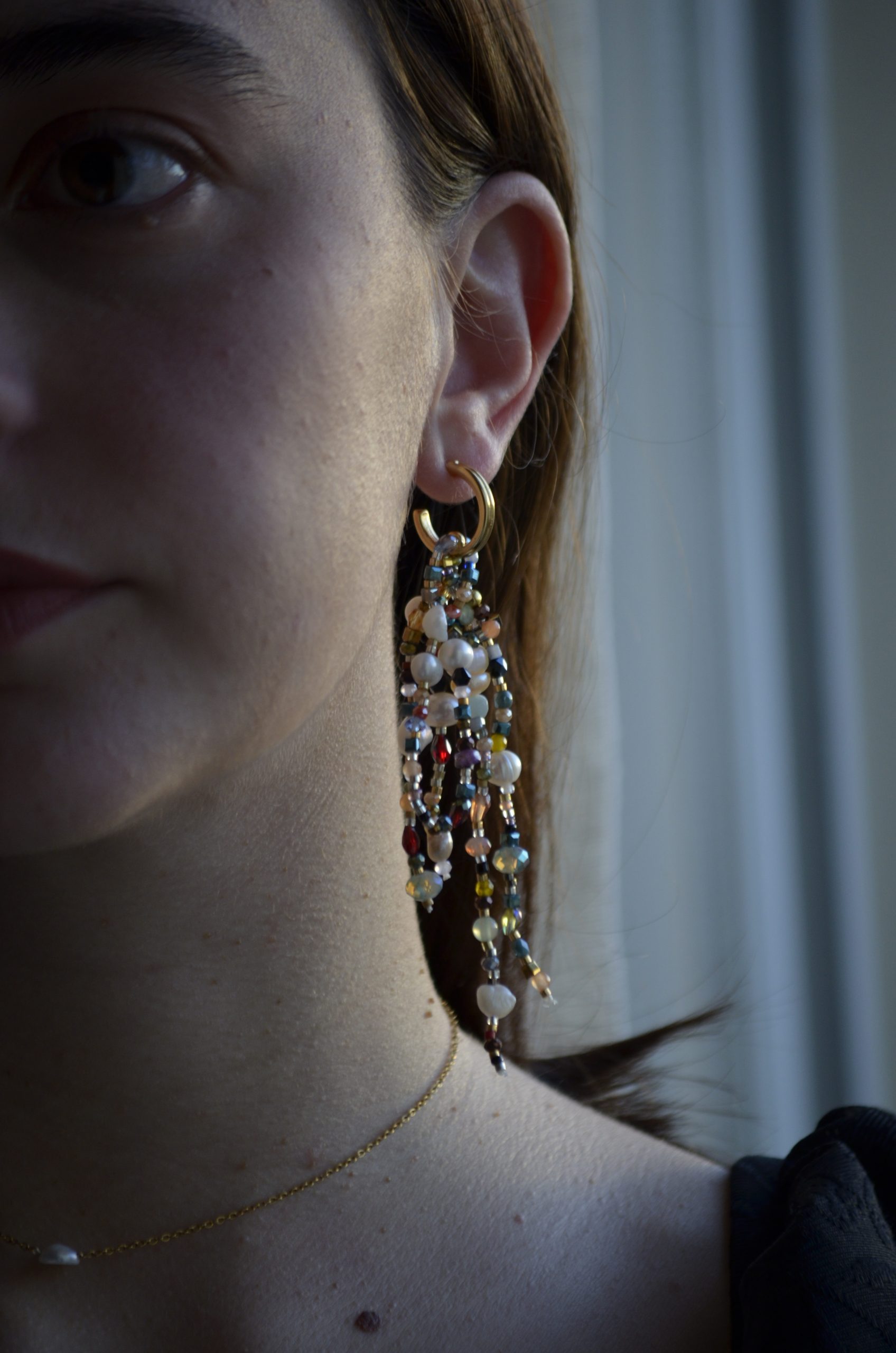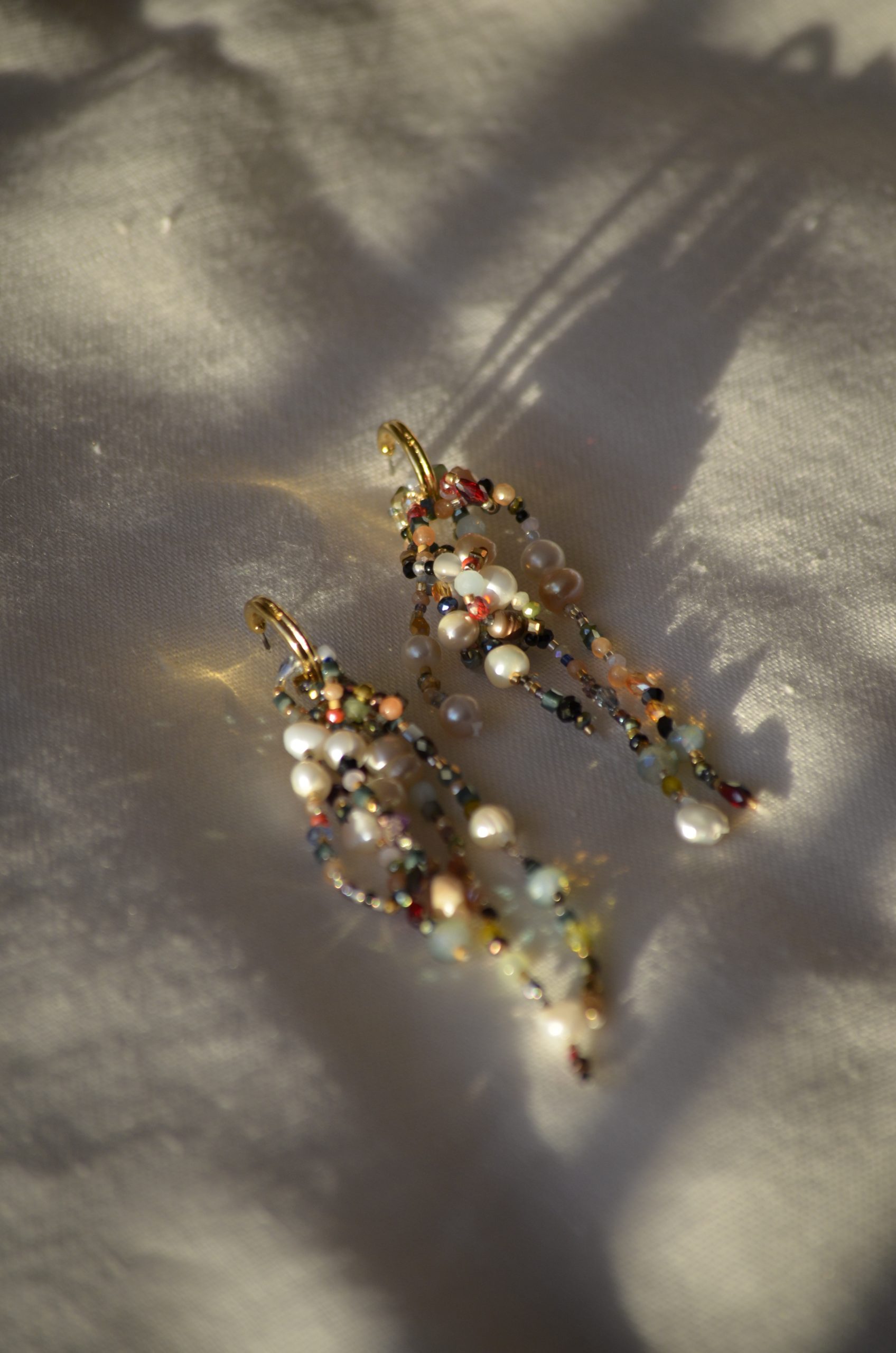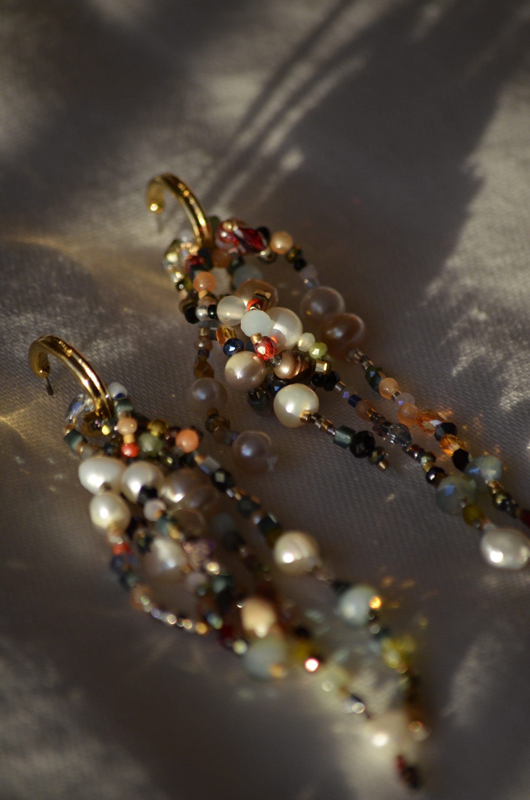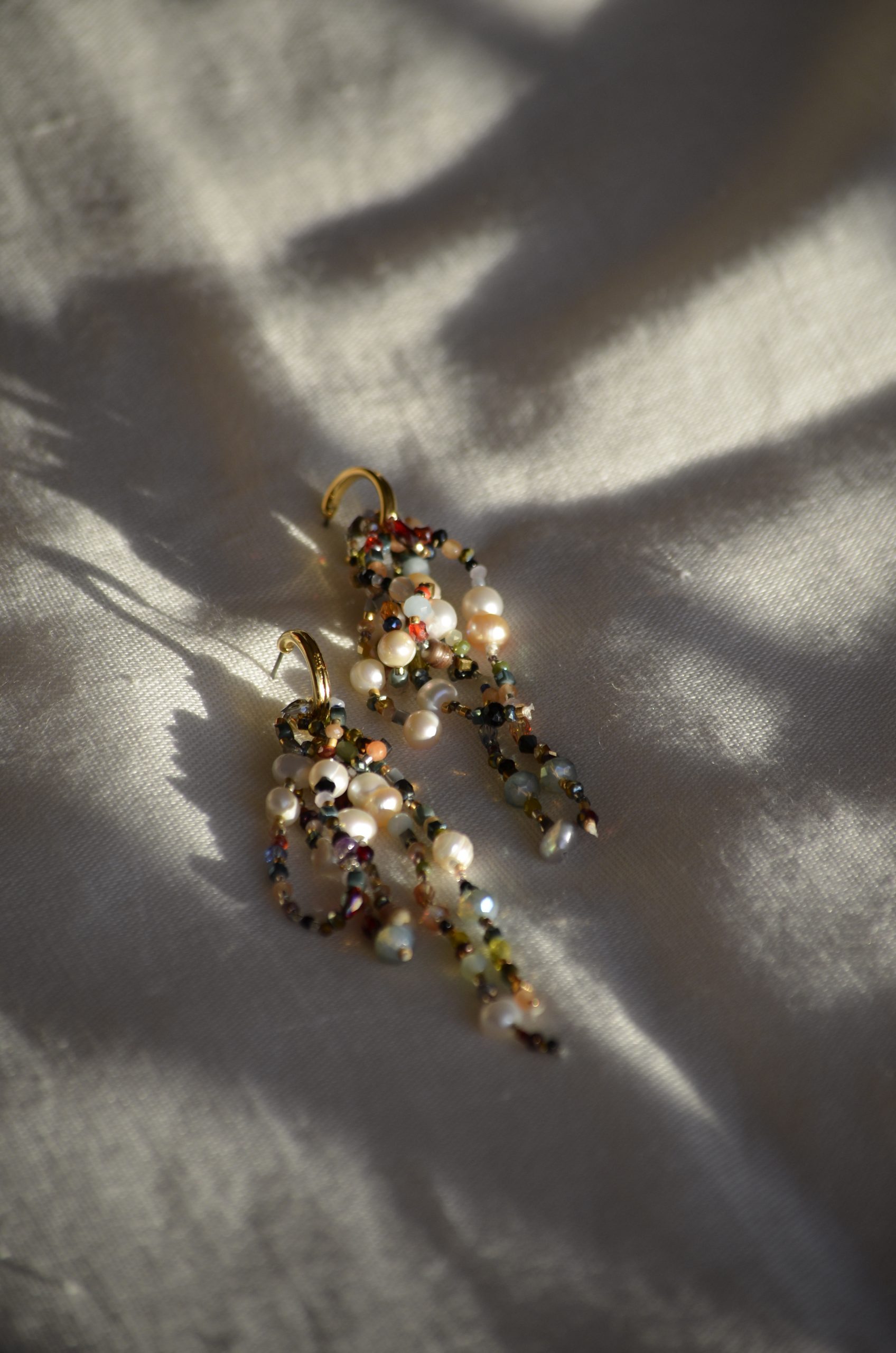Pendientes con perlas irregulares de agua dulce y cristales de colores.