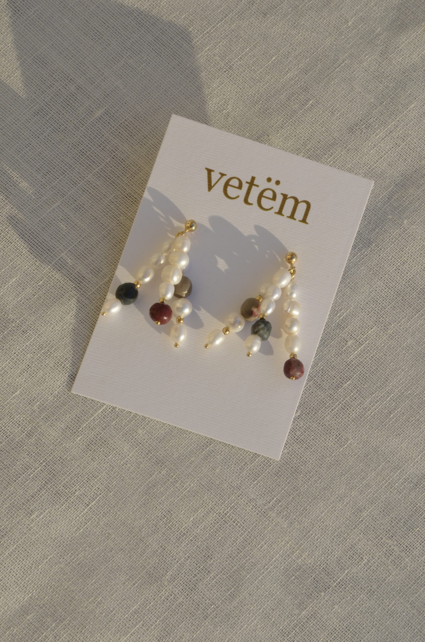 Pendientes modelados en arcilla polimérica con perlas de agua dulce. Todas las partes metálicas son de plata chapada en oro de 18K.