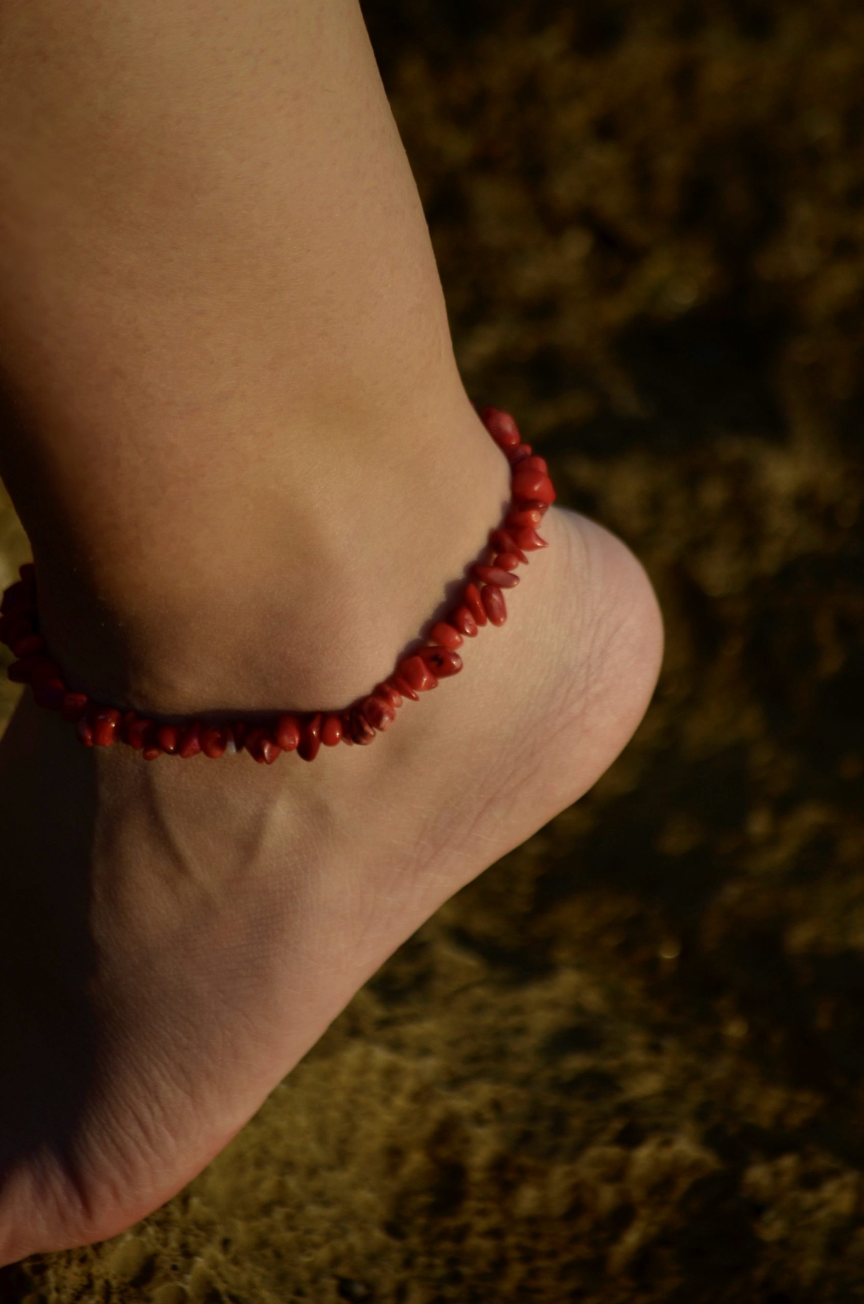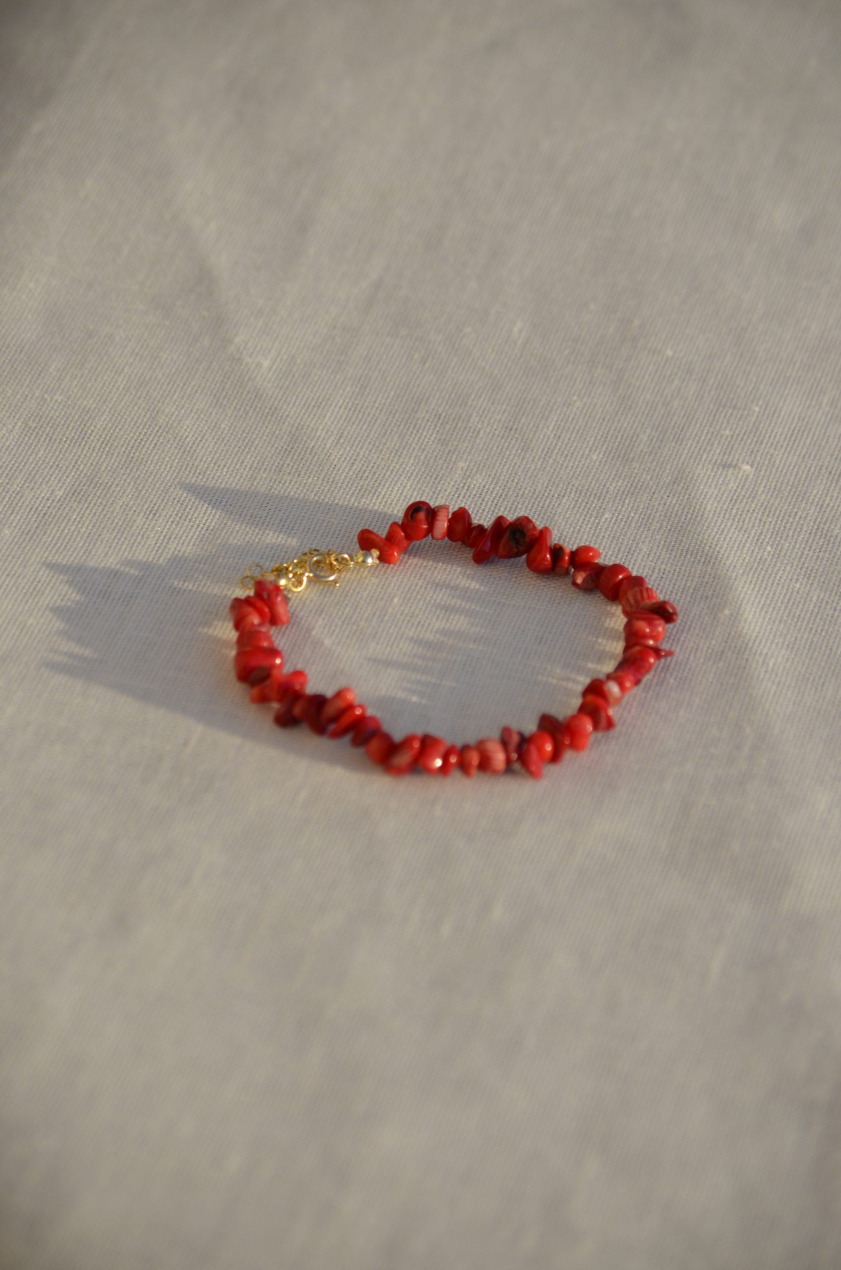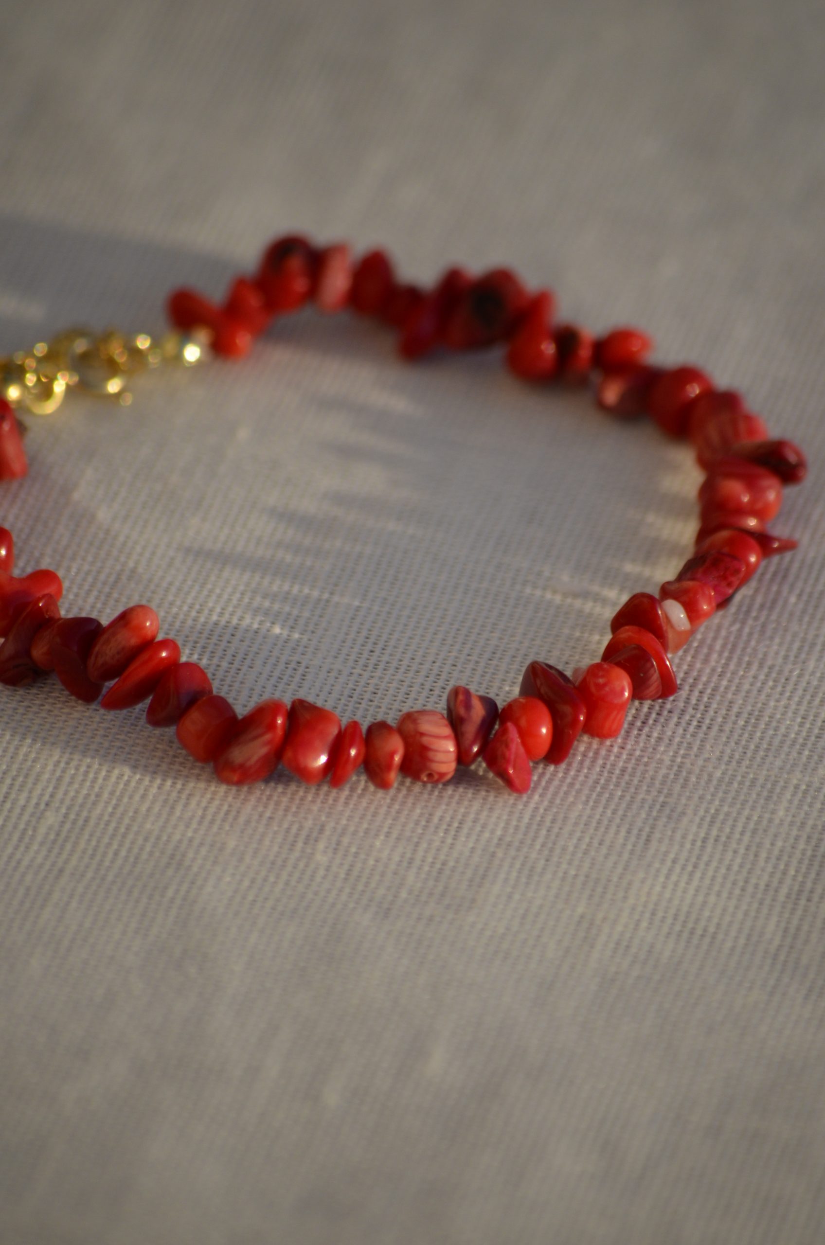 Tobillera con piedras de coral naturales. Cadena y piezas doradas de plata de ley bañada en oro de 18K.