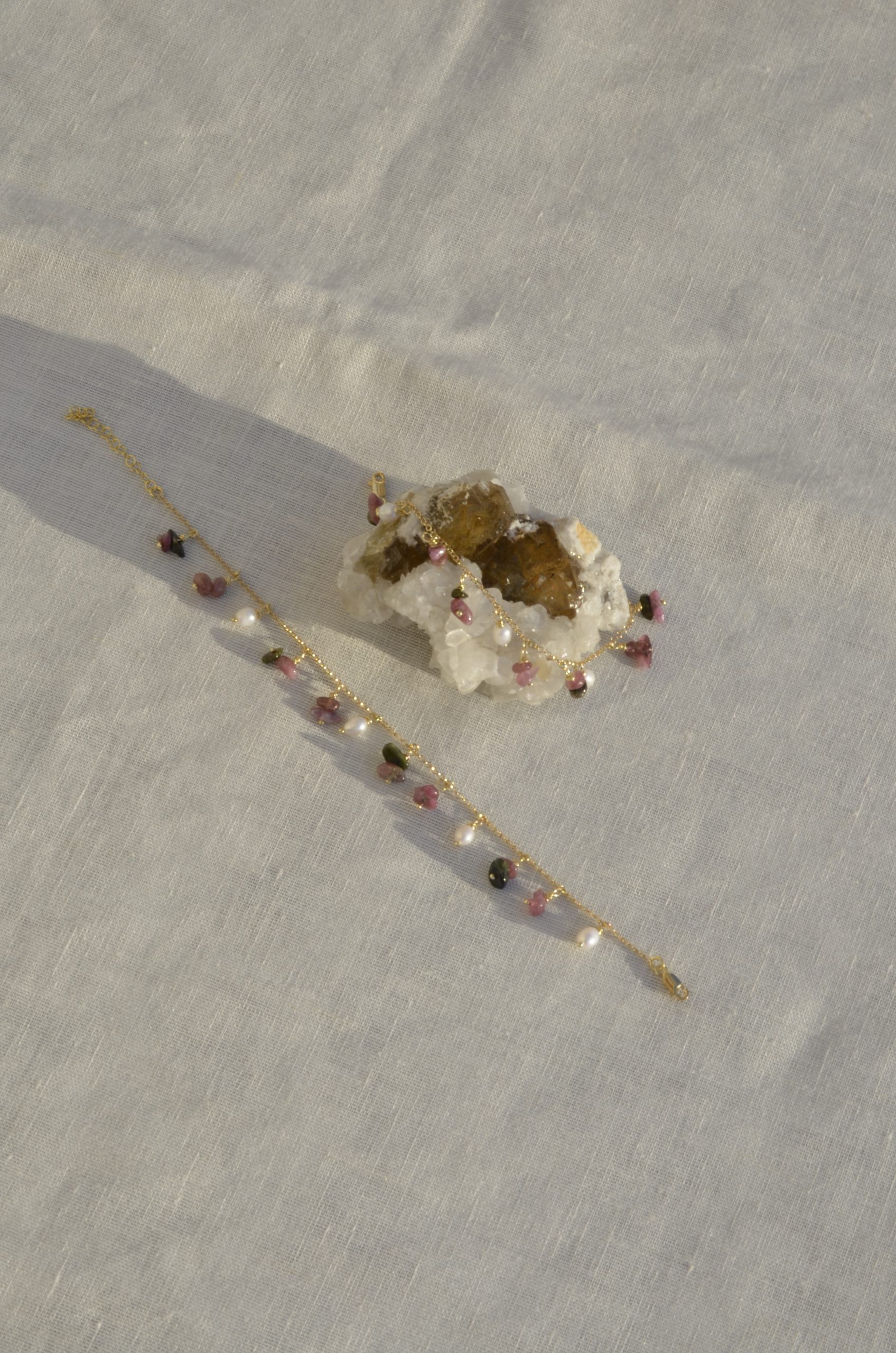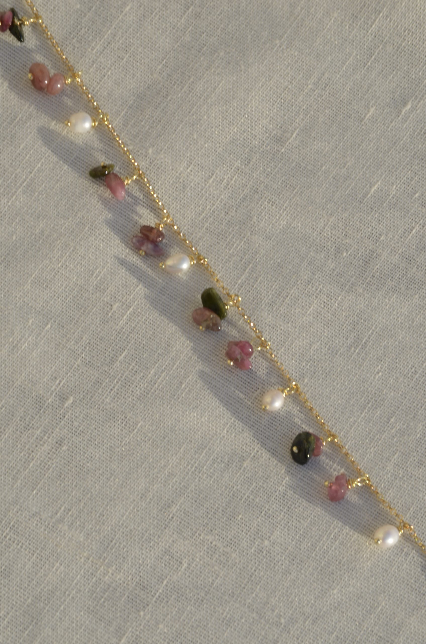 Tobillera con cadena en plata de ley chapada en oro. Colgantes de piedras naturales y lágrimas de arcilla polimérica.