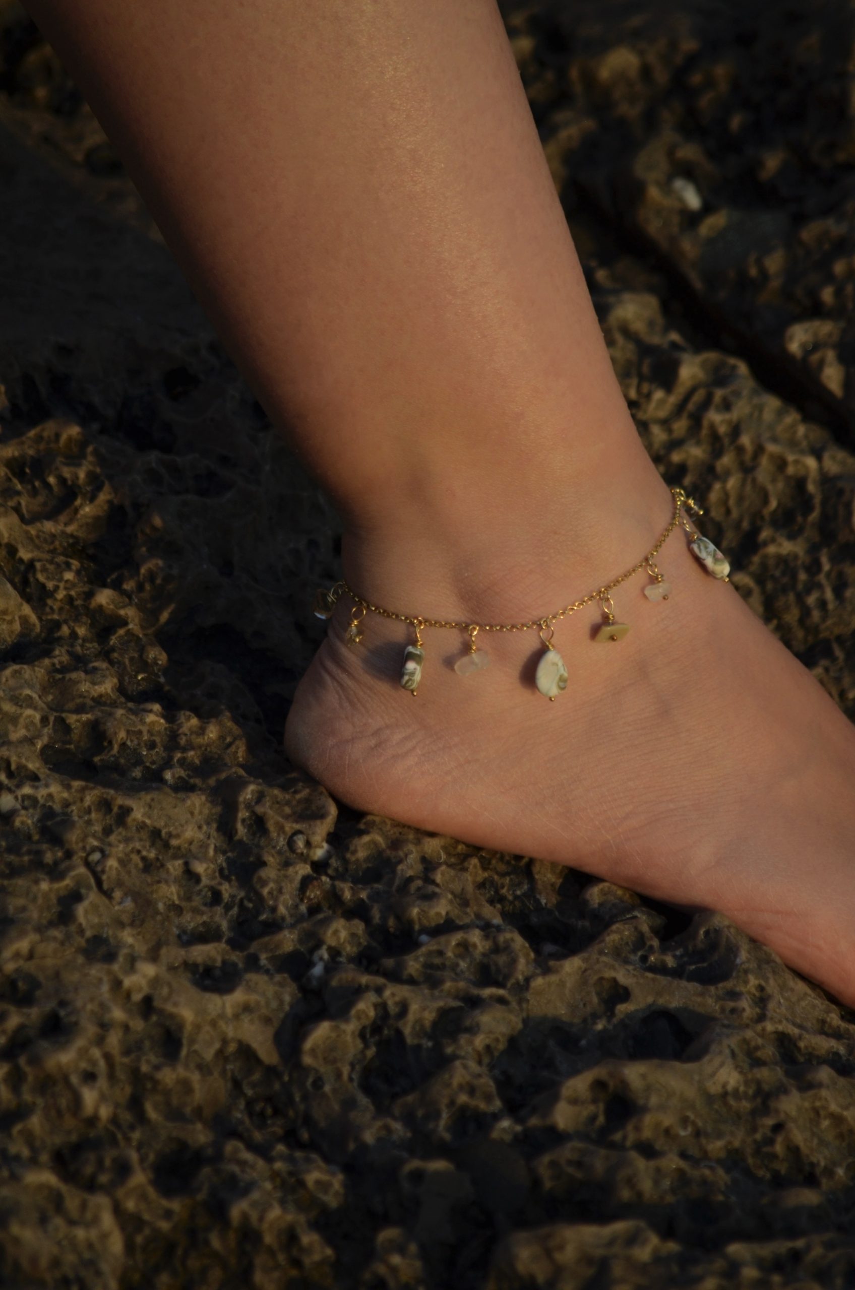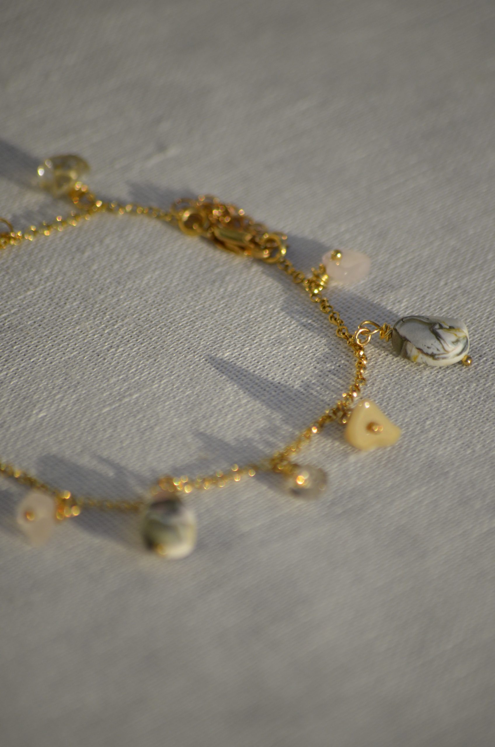 Tobillera con cadena en plata de ley chapada en oro. Colgantes de piedras naturales y lágrimas de arcilla polimérica.