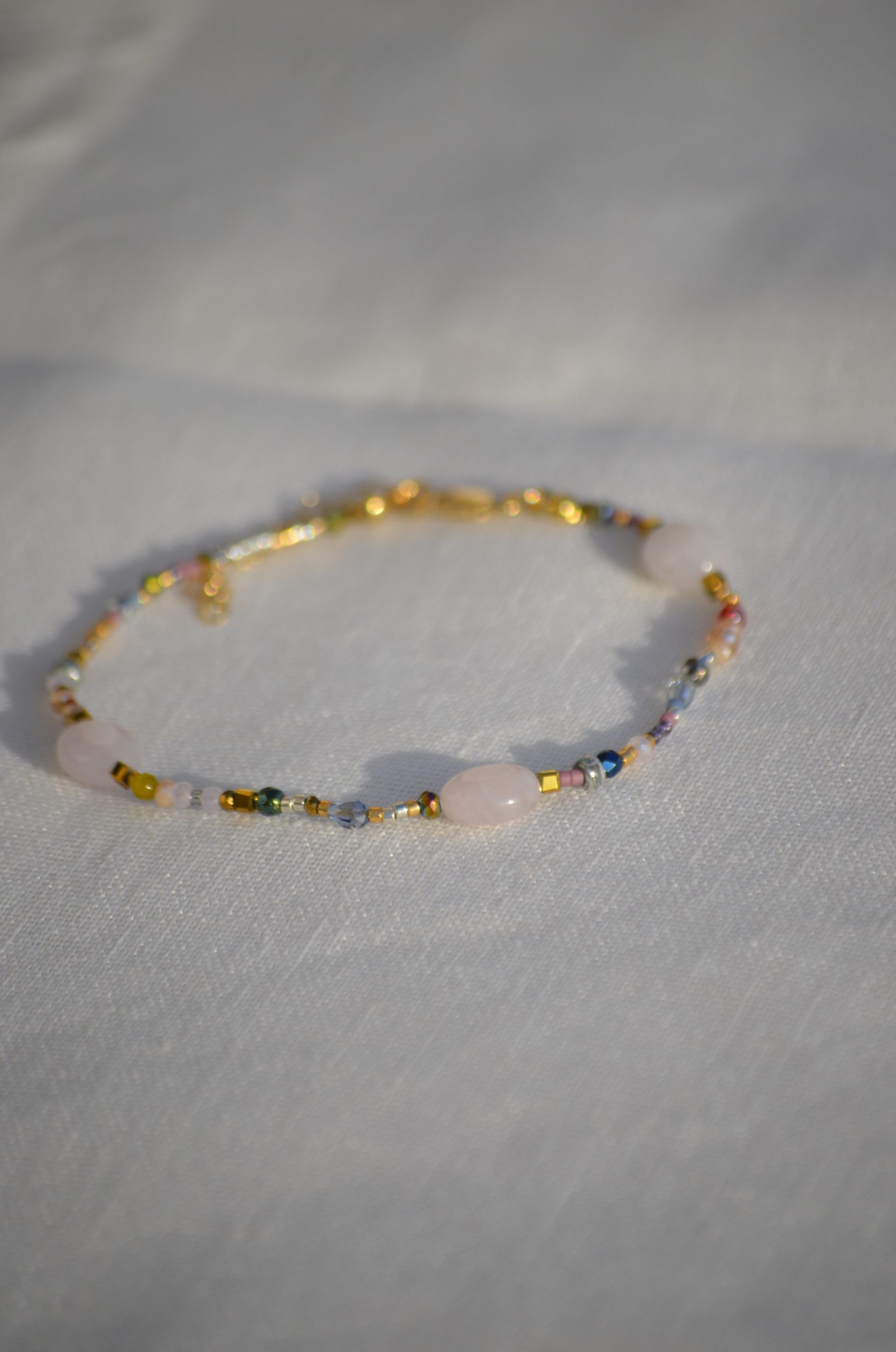 Tobillera con cuentas de cristales engarzadas a mano y piedras naturales de cuarzo rosa. Cadena y piezas doradas de plata de ley bañada en oro de 18K.