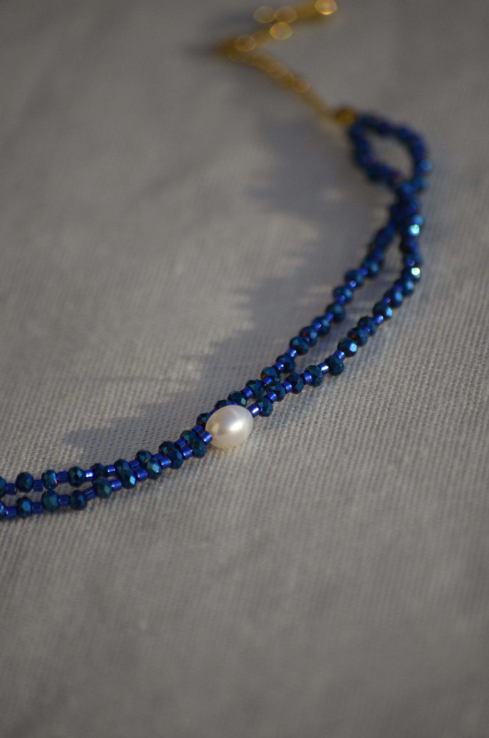 Tobillera con cuentas de cristales engarzadas a mano y perla de agua dulce. Cadena y piezas doradas de plata de ley bañada en oro de 18K y acero inoxidable.
